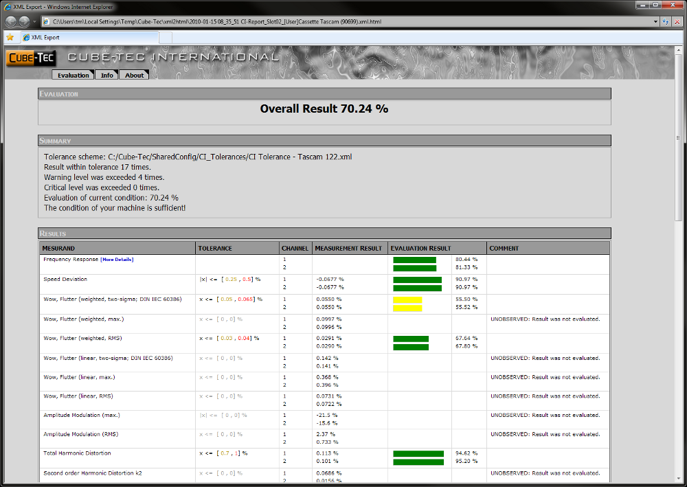 Once you have created a tolerance scheme for a specific device, it is very easy to keep track of the condition of your playback devices, because you can use this scheme over and over again without ever losing control of your gear's condition. From now on Calibration-Inspector can recognize any changes occurring in the condition of your machine(s), according to the specifications defined in the tolerance scheme. You can either use one of the predefined tolerance schemes included with the software, or define your own tolerance schemes tailored to your personal needs using the tolerance editor.