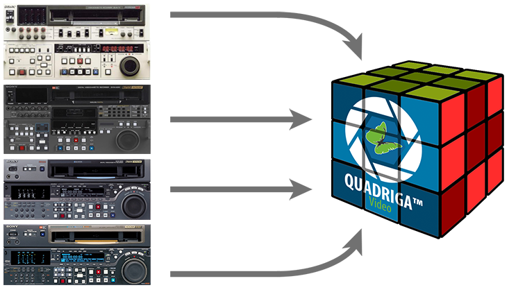 Das QUADRIGA•Video System kann bis zu vier parallele Videoströme aufnehmen, von einer beliebigen Kombination aus analogen oder digitalen Videogeräten (VTRs). Die QUADRIGA Machine Control Hardware ermöglicht die Fernsteuerung, Statusüberwachung und Gerätediagnose der VTRs. Alle Inputsignale werden automatisch überwacht.