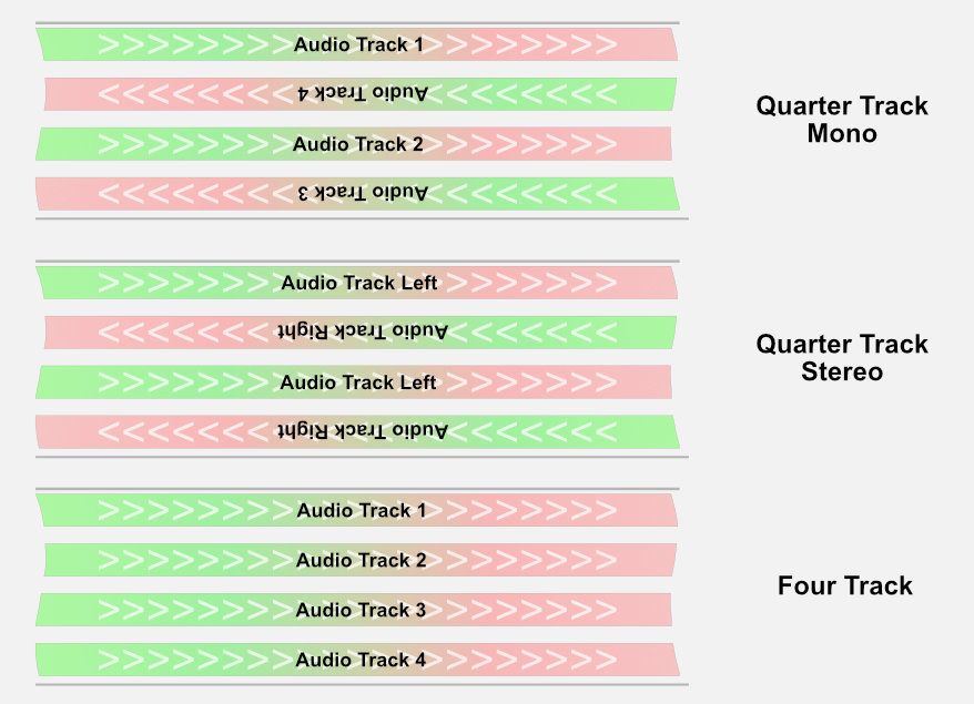 Bei den mit „Consumer-Recordern“ aufgenommenen ¼-Zoll-Bändern ist dies etwas anders. In den 1950er Jahren kam dies auch für den Bastler in Reichweite. Die Industrie wurde angeregt, jedes Jahrzehnt ein neues System mit Verbesserungen und neuen Spezifikationen auf den Markt zu bringen. Im Laufe der Jahre war es das Spurlayout auf einem Band, das den größten Einfluss auf die Austauschbarkeit hatte: Vollspur-Mono; Doppelmono; Vierspur und Stereo. Und ach ja, Quadrophonie in den frühen 70er Jahren, der Vorläufer des Surround-Sounds, ein Audio-Wiedergabesystem, das sich nicht wirklich durchsetzte. Jeder Trägertyp erfordert unterschiedliche Hardware.