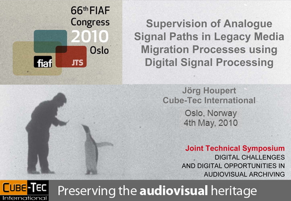 In Oslo, Cube-Tec's Technical Director Joerg Houpert has given an oral presentation entitled: Supervision of the Analogue Signal Paths in Legacy Media Migration Processes using Digital Signal Processing