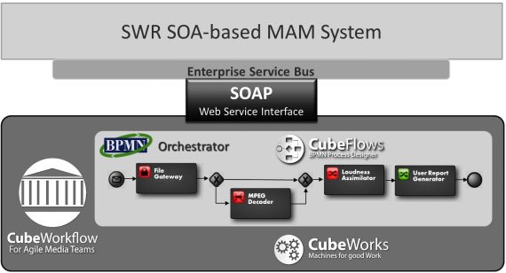 The German broadcaster Südwestrundfunk (SWR) has implemented a modern infrastructure based on Service Oriented Architecture. Cube-Tec delivered a system to manage Loudness Control and quality checks. The Loudness Calculator from Cube-Tec is integrated into the Enterprise Service Bus via SOAP interface. The service is in productive stage since July 2013.