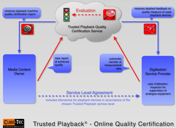 Cube-Tec International has developed a new online quality certification service for the surveillance of analog playback devices: Trusted Playback. By analyzing quality metadata generated by Calibration-Inspector, Trusted Playback documents the current condition of the analog playback devices used by a digitization service provider.