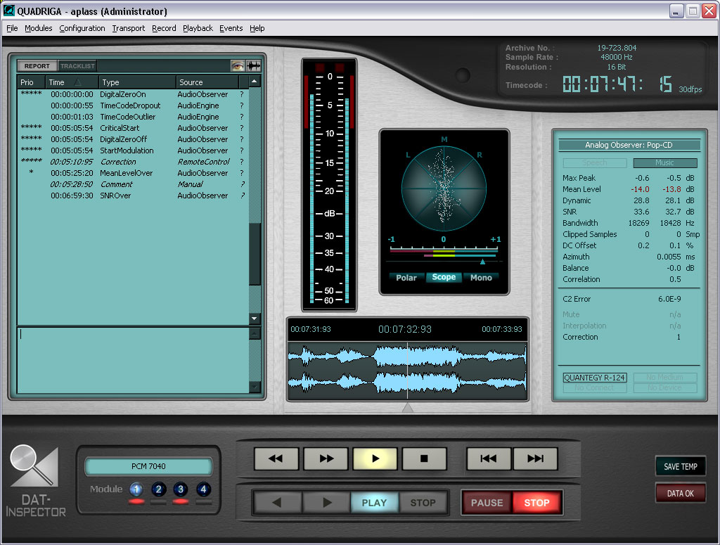 DAT•Inspector is the first system available world wide which allows faster than real time transfers of DATs into digital archives. The DAT•Inspector handles all DAT tapes which contain valid time code information. Besides monitoring the audio stream itself, the DAT•Inspector also monitors the time code track. Time code jumps and invalid areas within the time code will be recognized and reported.