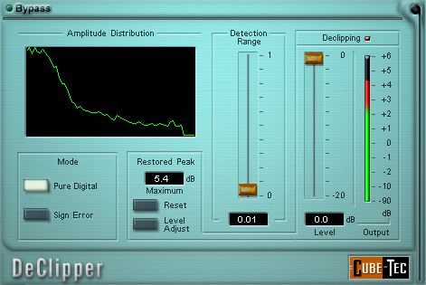A level histogram and a de-clipping LED make it easy to recognize clipped program. A value field displays how much additional headroom would be required to restore the missing peaks. Using the "Level" fader you can create the headroom needed, and the algorithm will automatically calculate the shape that the waveform would have had, if no clipping had occurred.