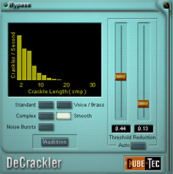 Once an algorithm is set, there are only two parameters required for manual operator control. The 'Threshold' control sets the level at which the DeCrackler begins to operate. The 'Reduction' parameter sets the amount of removed disturbances. An intuitive display monitors the real-time progress of the DeCrackler, displaying the number of disturbances removed at various click durations. An 'Audition' mode allows the operator to listen to the removed disturbances in real-time - even while parameters are adjusted.