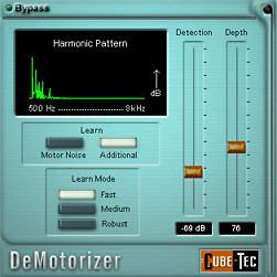 This new type of harmonic compensation ensures that only the harmonic components of the noise source are being removed, without influencing the desired signal or creating artifacts. In order to make this possible, the DeMotorizer has an intelligent learning function that is initiated by the user. Once this 'learn' process is complete, reduction of the motor noise can be adjusted using the 'Detection' and 'Depth' sliders.