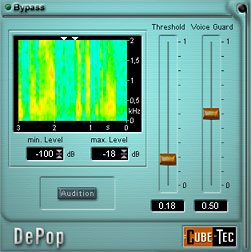 DePop is the first real-time restoration processor designed specifically to remove low frequency impulse noise bursts, typically associated with optical film sound.