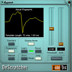 The algorithm adapts automatically to the signal. The level at which the removal of scratches begins can be adjusted with the "Threshold" control, and the "Soft" control enlarges the detected range that should be interpolated by the algorithm. In order to help set the parameters correctly, a real-time display shows the detected scratches over a moving time line. More importantly, the "Audition" function permits the operator to 'solo' the removed disturbances in real-time, while changing the various parameters.