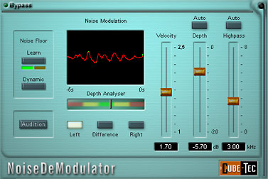 NoiseDeModulator completely "demodulates" time variant noise, so that other AudioCube tools such as DeNoiser, SpectralDeHiss and SpectralDeHiss Expert can function more effectively.