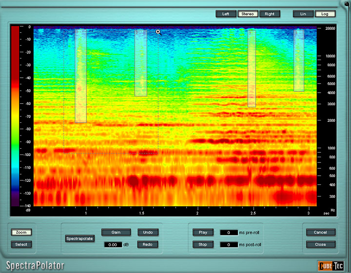 Typical applications include the removal of coughs or ringing cell phones from live recordings, among many others. The ability to separately select the "time/frequency" region that requires interpolation, combined with a fast and accurate zoom function and unlimited undo, adds a new dimension to the Cube Waveform-Restorer. The high resolution SpectroGraph displays your audio data in a time-versus-frequency window and then allows you to accurately display, audition, select and interpolate only the required program component.