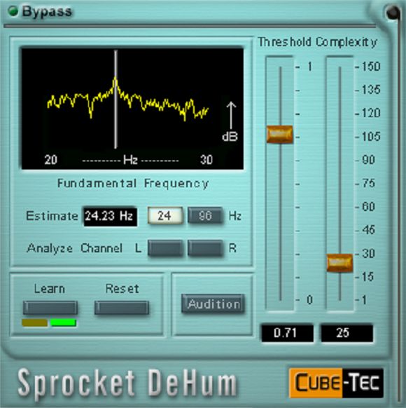 A high-resolution real-time 'audio analysis' displays the frequency range between 20 to 130 Hz with single cycle resolution. A real-time "Learn" function analyzes the audio signal, defines the dominant harmonic of the disturbance and then creates a harmonically related filter set. This filter set is ordered by descending attenuation requirements. The operator can then move the "Complexity" fader to define the number of filters required to remove the disturbances.