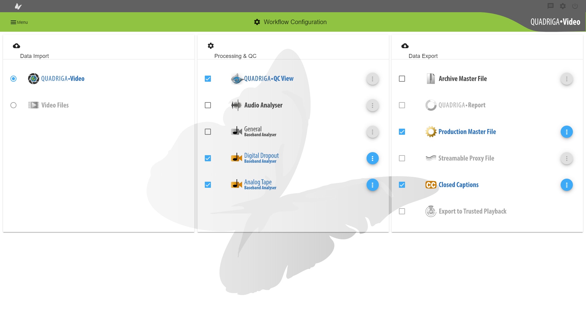 QUADRIGA•Video is a migration workstation designed for the quality-controlled transfer of video tapes into archive files on a large-scale. For best efficiency QUADRIGA•Video supports simultaneous, parallel capturing from video playback machines (VTRs) in any combination.