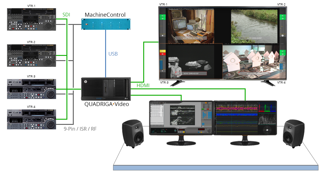 QUADRIGA•Video RF is the next generation technology to transfer video tapes e.g. Betacam SP into files for networked TV- or video-production and for deep archiving. It is scalable from manually controlled single channel ingest workstations up to a fully automated migration factory.