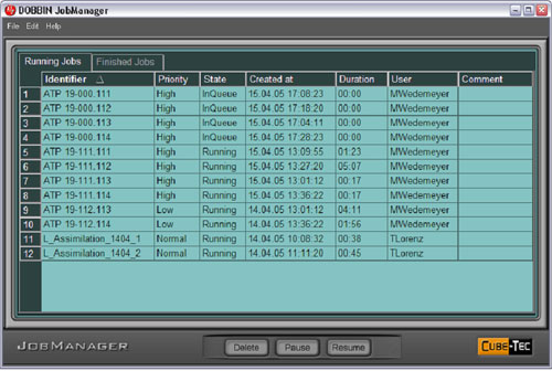 The user controls the current DOBBIN jobs remotely from his workplace PC. Individual user rights are defined in the Cube-Tec UserManager. The JobManager can display status events from the DOBBIN ControlUnit using the RemoteLogger View. The RuleEditor is used to define a highly flexible client data filter, enabling the filtering of unwanted events from the entire stream of logfile events.