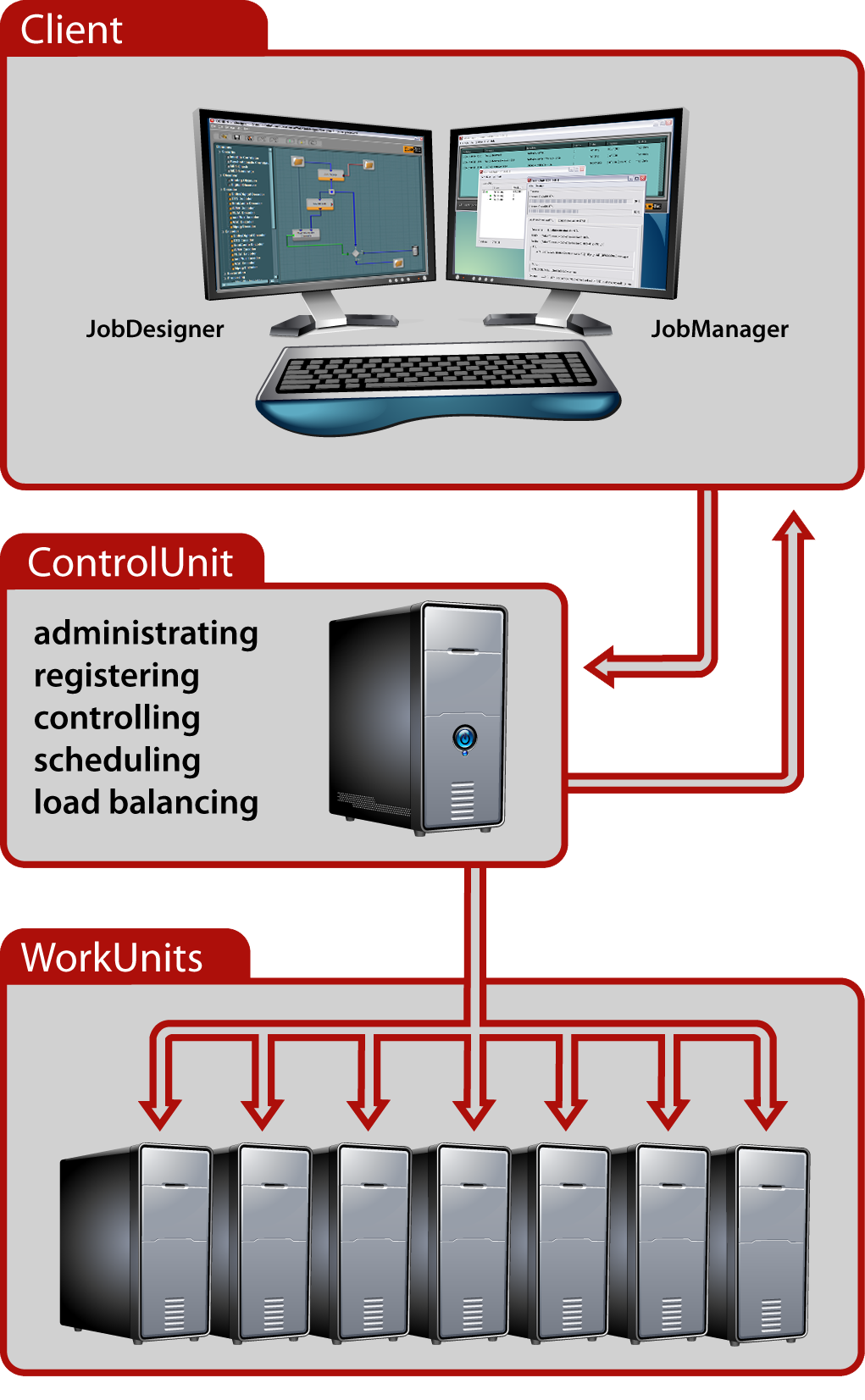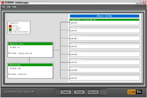 The ControlUnit is the heart of DOBBIN. It is invisible to the user. All JobClients post their jobs to the ControlUnit. The jobs are registered, collected and scheduled according to the job priority of the WorkUnits.