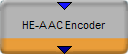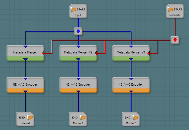The left example illustrates how the HE-AAC Encoder can be used for different markets as the three encoders are set to produce different output formats. Encoder 1 is configured for M4A output, which best suits the use of the output material for websites, while Encoder 2 and 3 are configured to produce 3GP output files with different bandwidth settings, suited for the use in mobile markets.