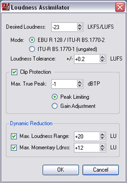 Another optional function is the automatic dynamic reduction which carries out compression of audio files in order to bring their dynamics below a defined Loudness Range threshold or maximum Momentary Loudness level. This is a useful feature when, for example, having to match Loudness Range of audio material with the dynamic range of transmission paths.