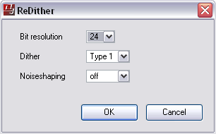 Dithering is a method for reducing quantization errors in digital recordings. Often, dithering is applied when recording. In the case of WaveLab though, dithering is applied when reducing the number of bits in a recording, for example when changing from 20 to 16 bits and when applying processing.