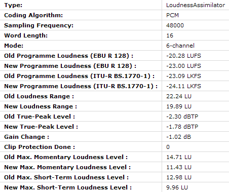 All relevant loudness parameters are calculated by both the Loudness Calculator and Loudness Assimilator FPUs. The latter provides the results of the input file and the ouput file - thus changes by Loudness Assimilator can be tracked. The complete measurement results are included in the file-based metadata and are therefore accessible from both within DOBBIN and outside of DOBBIN.